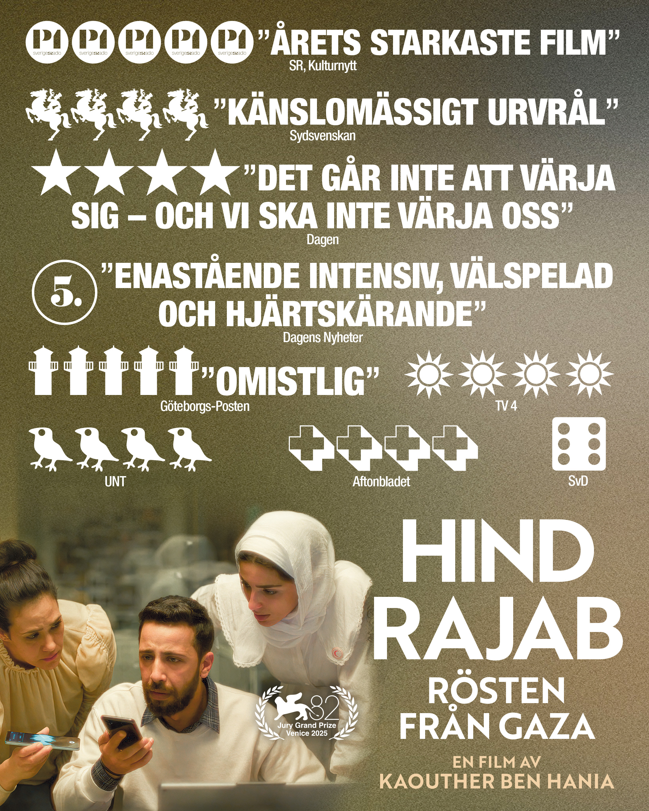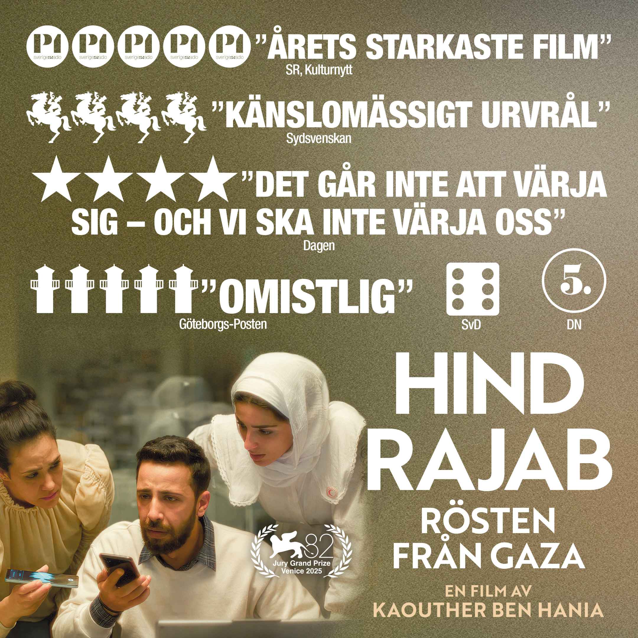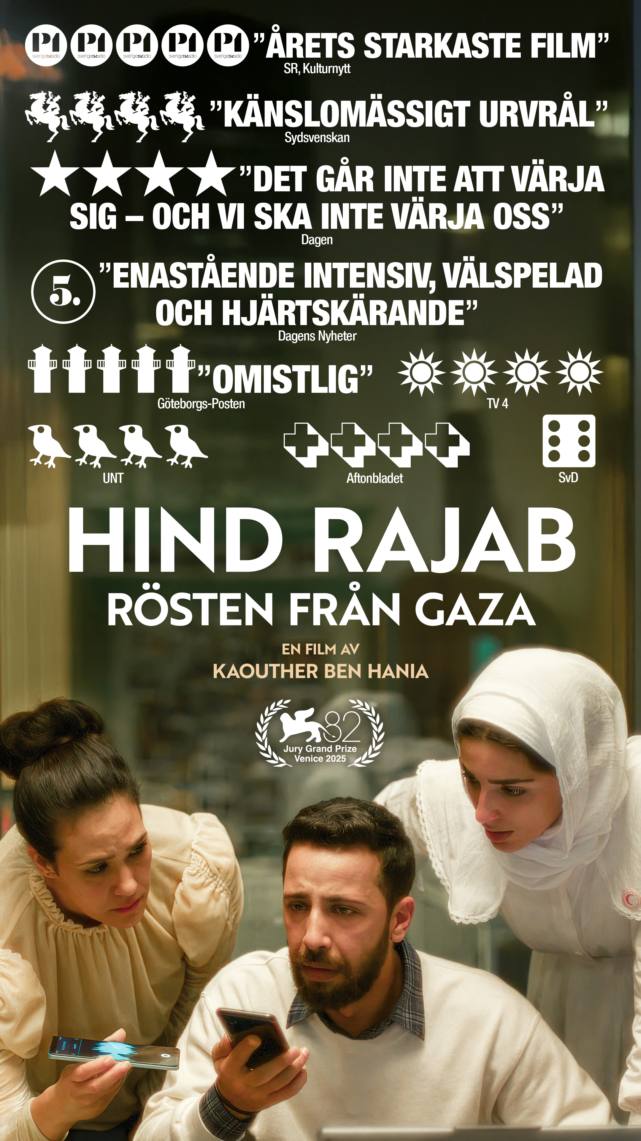 Hind Rajab – rösten från Gaza är ett intensivt och omskakande drama baserat på verkliga händelser och det autentiska nödsamtalet till Palestinska Röda Halvmånen. Filmen är regisserad av Oscarsnominerade regissören Kaouther Ben Hania och belönades med Grand Jury Prize vid Venedigs filmfestival 2025 och öppnade Gaza International Women’s Film Festival. Som exekutiva producenter medverkar några av filmvärldens mest uppmärksammade namn, däribland Brad Pitt, Joaquin Phoenix, Rooney Mara och Jonathan Glazer.